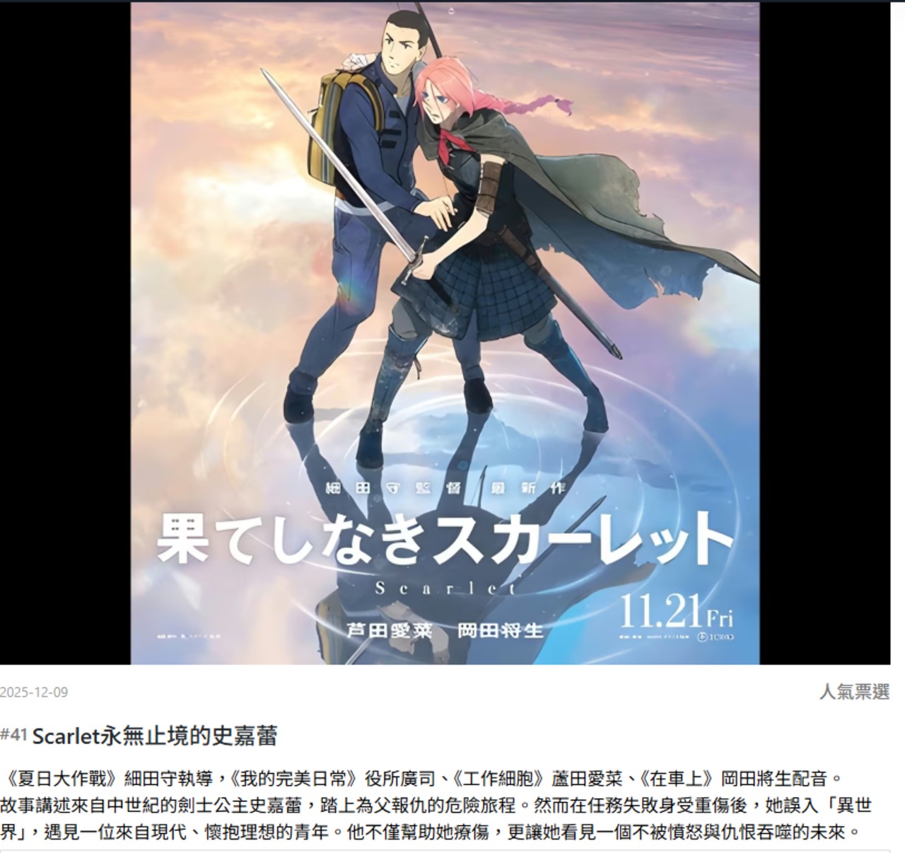 今年你看了多少部動畫電影呢? 4gamers現在在舉辦2025年的動畫電影大賞投票,我自己覺得今年應該在鏈鋸人還有鬼滅之刃無限城篇很猶豫(蕾潔實在太婆,炭志郎騙走我太多眼淚),不過我想替12/10號剛上映的另一部動畫電影拉拉票 Scarlet永無止境的史嘉蕾的劇情很吸引我,感覺是一部在討論死亡還有永生的電影,我不覺得永生是好事,這部動畫給我很像宮崎駿的蒼鷺與少年的感覺,我覺得是蠻有趣的一部電影,12/10才上映對它要贏大賞真的很不利,有興趣的朋友可以去看看吧