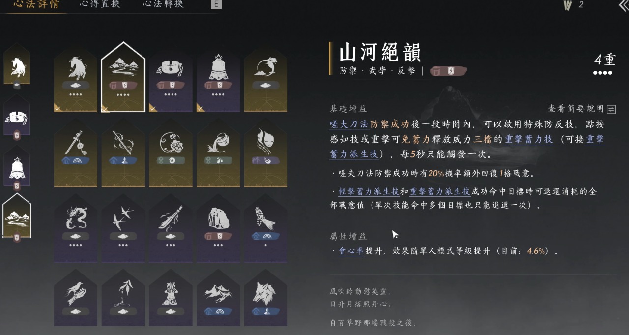 - 山河絕韻(核心必帶): 陌刀輸出的靈魂。改版後的防反判定更加優秀,配合山河絕韻,能讓你在防禦反擊時打出毀滅性的傷害。