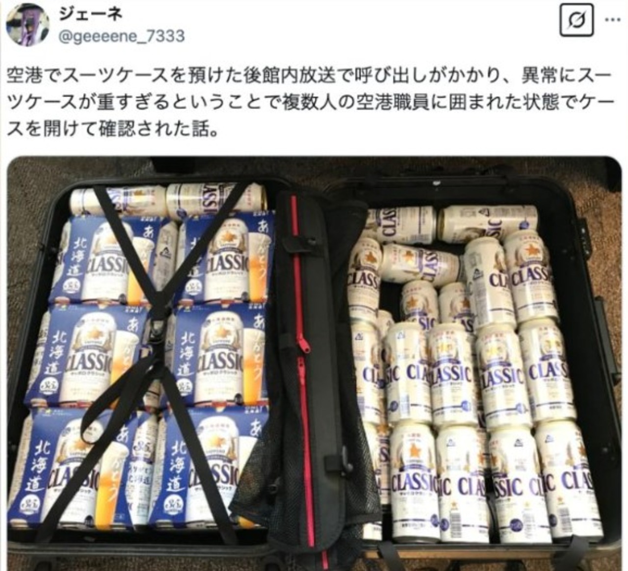 根據日媒《まいどなニュース》報導,一名日本男子在社群平台X上表示,在機場托運行李之後,突然聽到機場廣播,他嚇得以為是行李箱出了什麼事,沒想到是因為超重的關係,他在多名機場地勤人員圍觀之下,被要求打開了行李箱,整個行李箱塞滿了北海道限定的「札幌經典」(Sapporo Classic)啤酒。