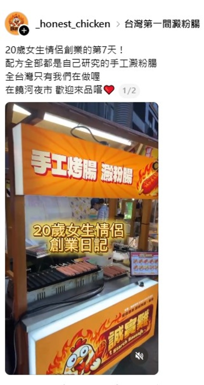 一對20歲的女生情侶檔,在台北饒河街夜市開攤,宣稱推出「全台灣第一間澱粉腸」攤位。