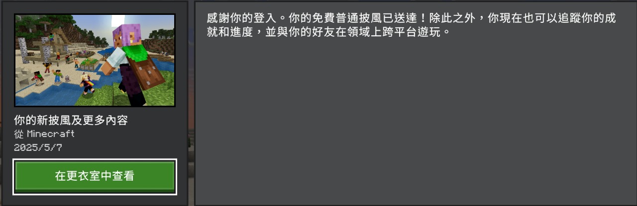 現在登入基岩版就可以領取"普通"披風
