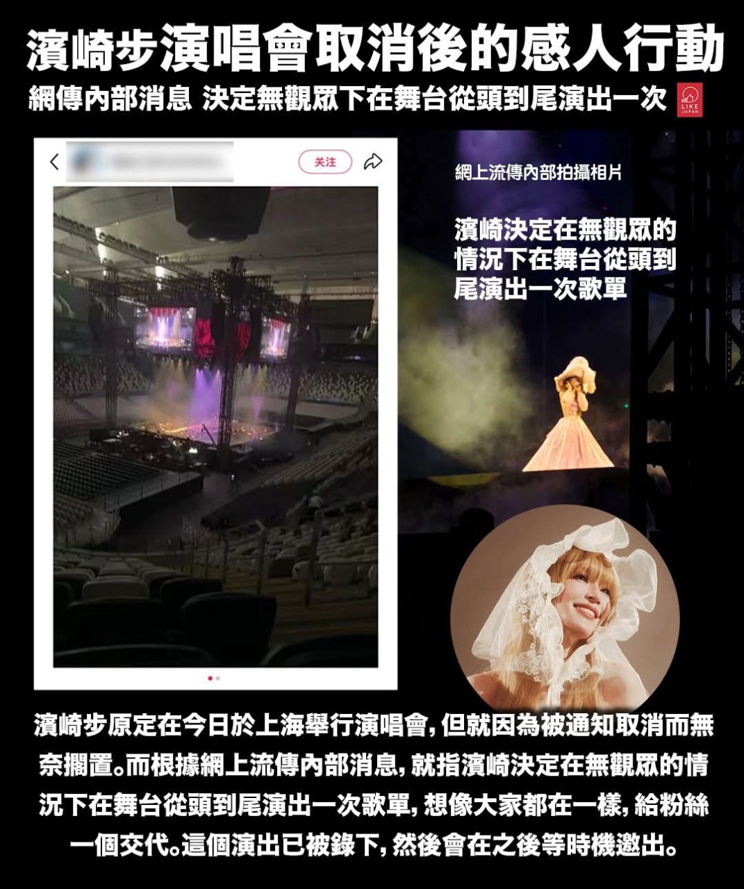 對粉絲來說,雖然演唱會取消帶來巨大失落,但看到濱崎步依然站上舞台、完成屬於當天的表演,