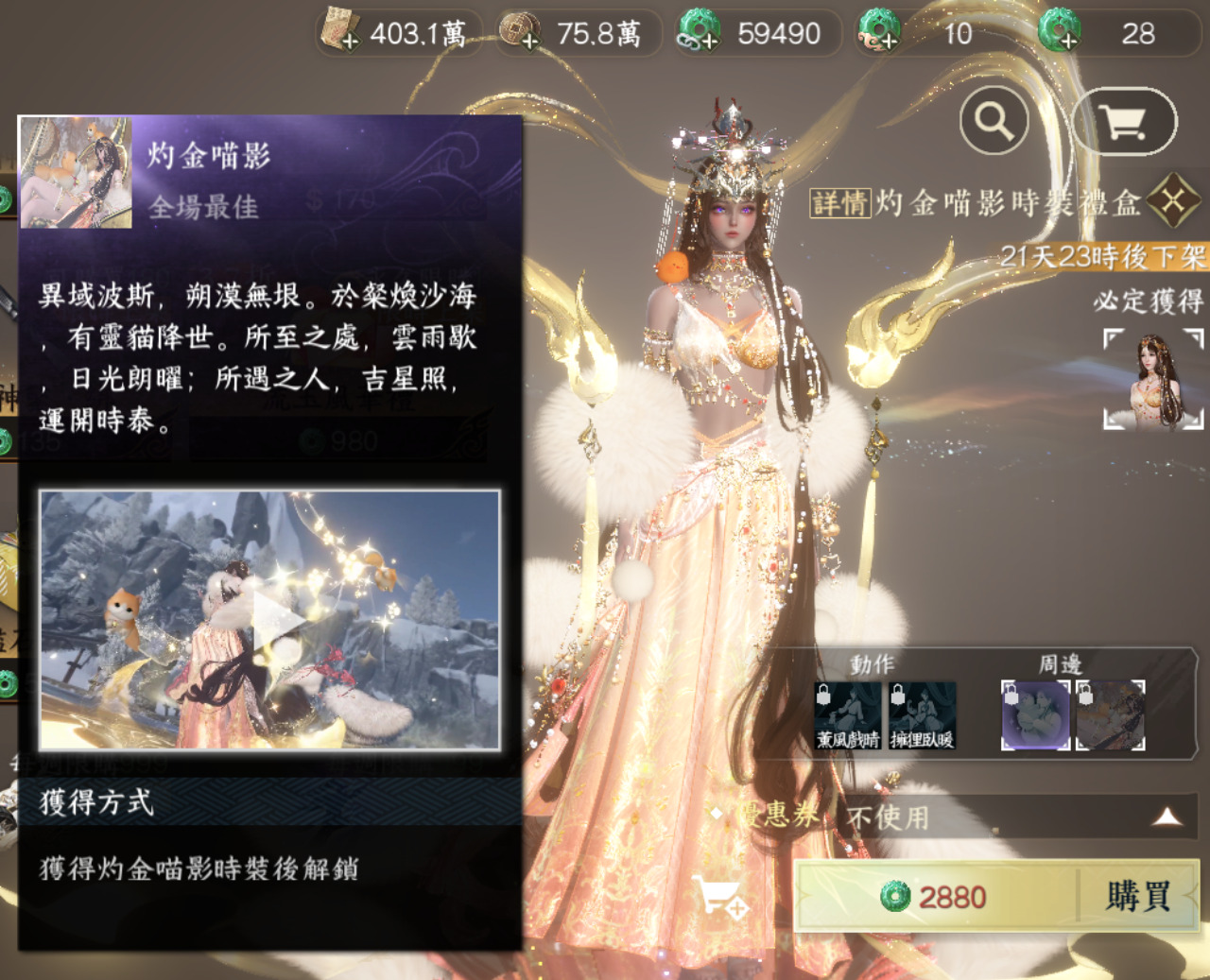 像我這類玩家就是買買普通的時裝,平常一百多塊的月卡送的300紋玉累積加上各類活動白嫖的代金券,就讓我可以獲得很多時裝,就像下圖的右下角可以發現我有很多代金券,而代金券可以疊加兩張,像這個以貓咪為主題的時裝還有附帶主動施放的動作兩個,待機動作,打副本打PVP得到MVP時的鏡頭動作,是最近特別受歡迎的時裝。不用大價錢去抽特別華麗的時裝(天賞)就可以讓自己的角色富有特色。