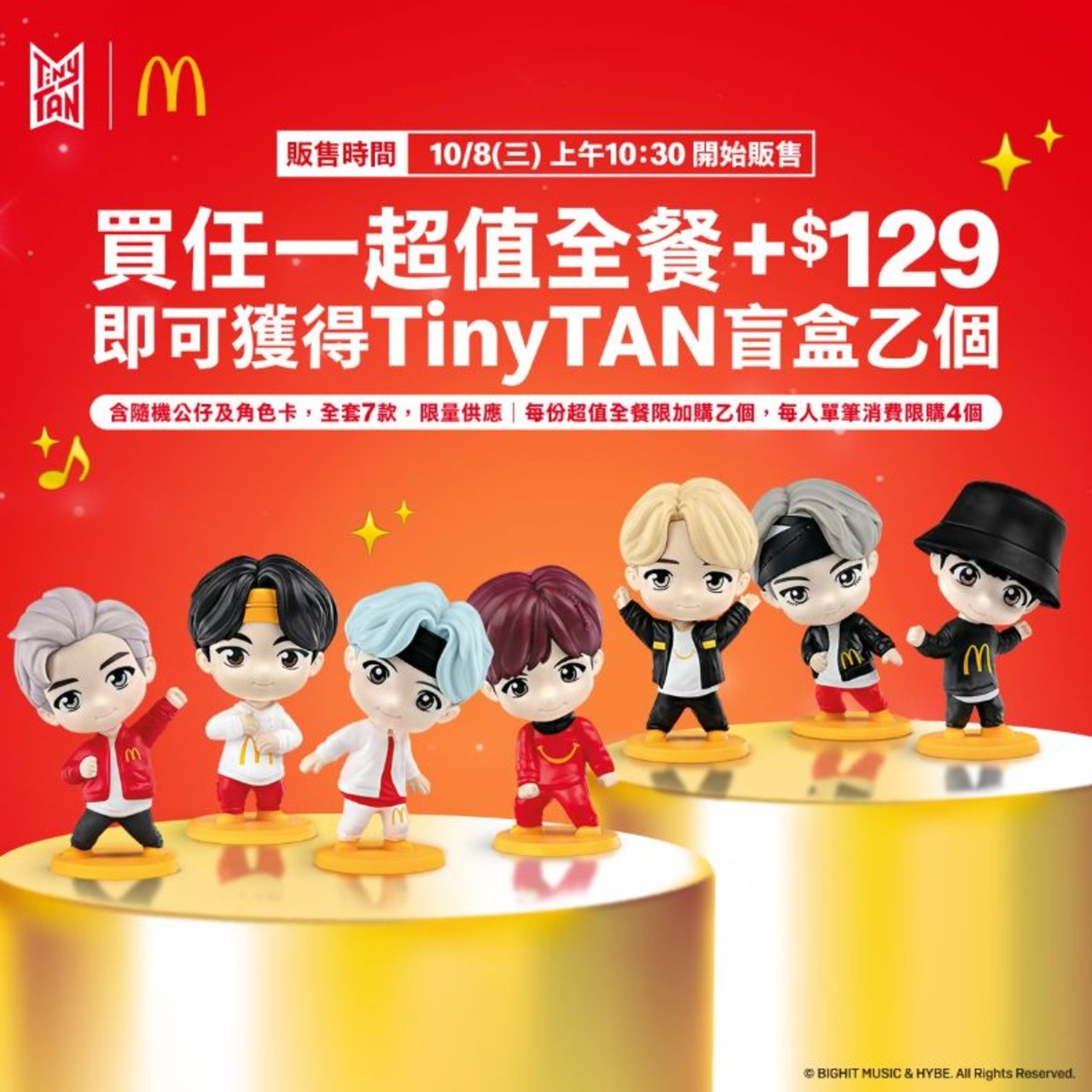 凡於麥當勞指定櫃檯購買任一超值全餐,即可加價129元獲得1個TinyTAN盲盒(含隨機公仔與角色小卡),每份套餐限加購1個、每人單筆最多4個,不可挑款,數量有限、售完為止。