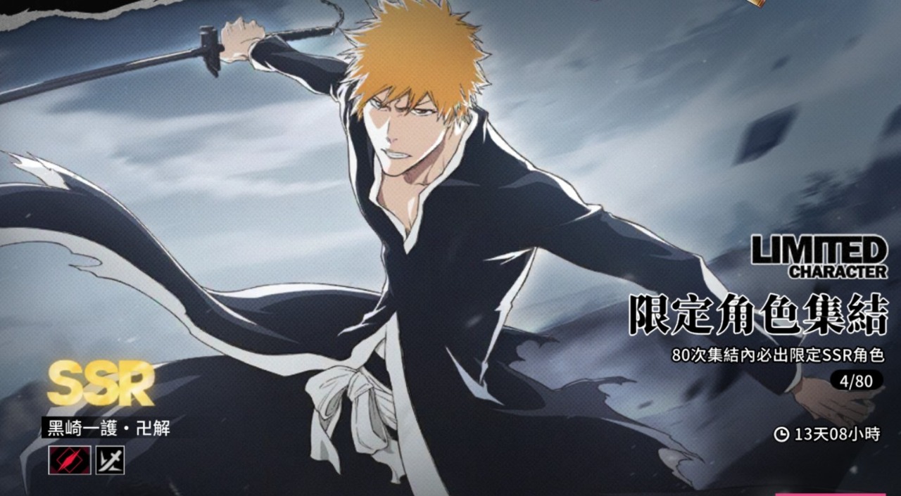 這次開服限定就是 SSR 黑崎一護。如果你是慢慢玩的節奏,80 抽基本上能把他撈出來。