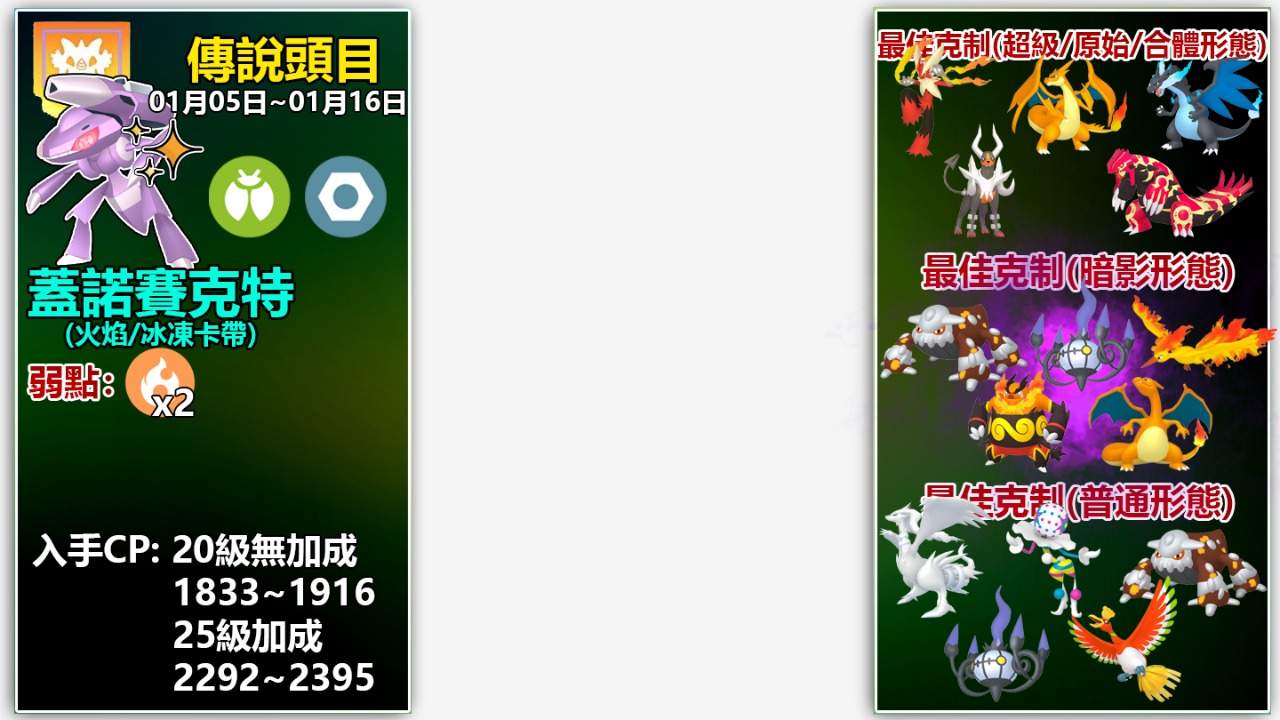 蓋諾賽克特的弱點被火係雙克制,入手CP20級最高為1916、25級則是2395,