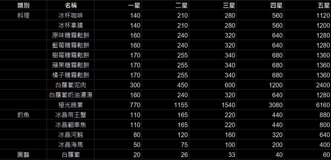 如果你當週相當忙碌,那可以先把材料買起來,有空時再做出來販售就好,兩倍收購消耗完後,多出來的材料就做極光晚宴或白蘿蔔泥肉。因為根據表格,我們做這兩個料理拼多星得到的利益最大,如果你很大量,不妨使用花束再製作料理。
