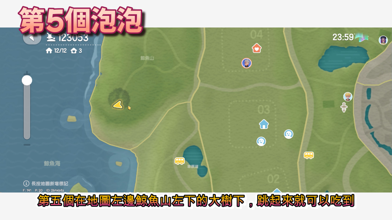 第五個在地圖左邊鯨魚山左下的大樹下,跳起來就可以吃到