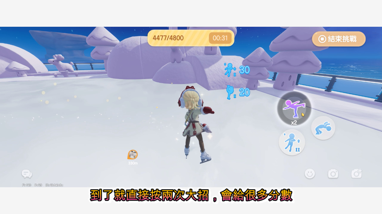 冰雪季的溜冰,技巧就是輪流使用不同的姿勢,也記得要在角色發金光後才按,分數才會高,計量表最高可以累積到兩個大招,到了就直接按兩次大招,會給很多分數,可以輕易解掉挑戰跟點出溜冰的天賦。