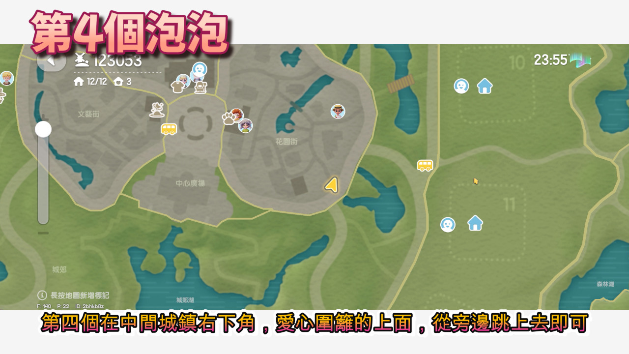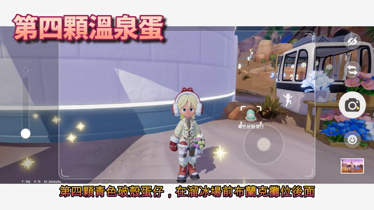 第四顆青色破殼蛋仔,在溜冰場前布蘭克攤位後面,拍完照之後前往地圖右邊小鹿塔附近,它的泡泡在一個路燈上面。
