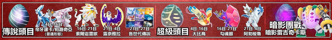 4日和11日皆是普通形態的帝牙盧卡和帕路奇亞,18日輪到索爾迦雷歐,25日才是露奈雅拉,