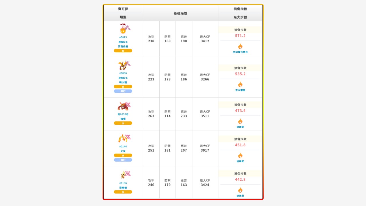 具體實用性未明,不過強大的火係極巨戰力已有超極巨化閃焰王牌和噴火龍等霸榜了,