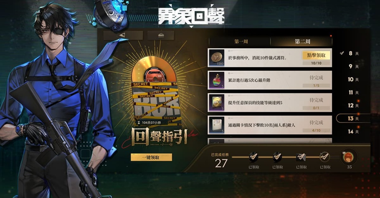 新任科長的福利不只如此,開啟「回聲指引」活動功能後,14 天內每天都會解鎖新的指引任務,同樣可以有豐厚的獎勵入袋,其中同樣包含了「黑膠訊息數據」、「金唱片」、探員飾品及培育探員素材。
