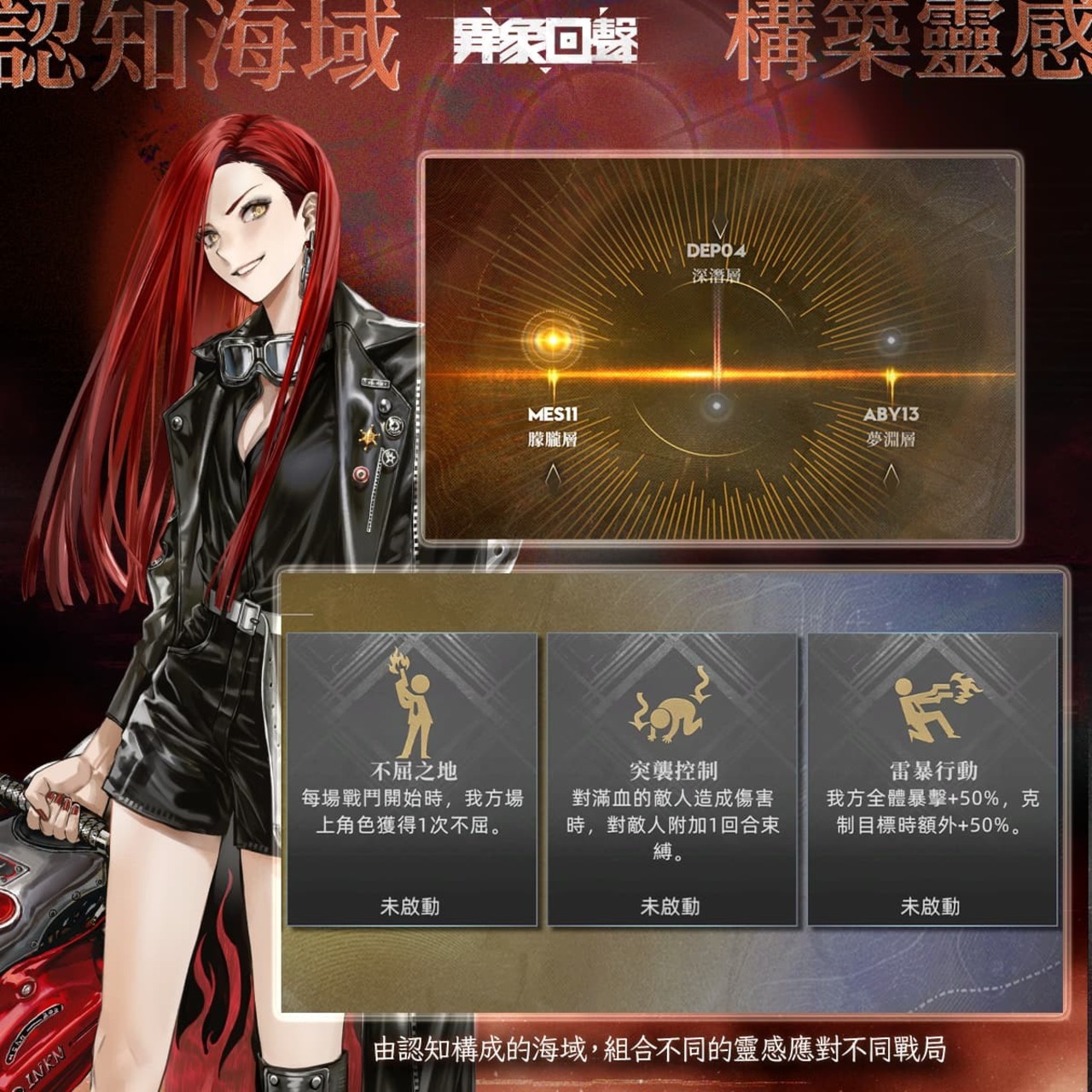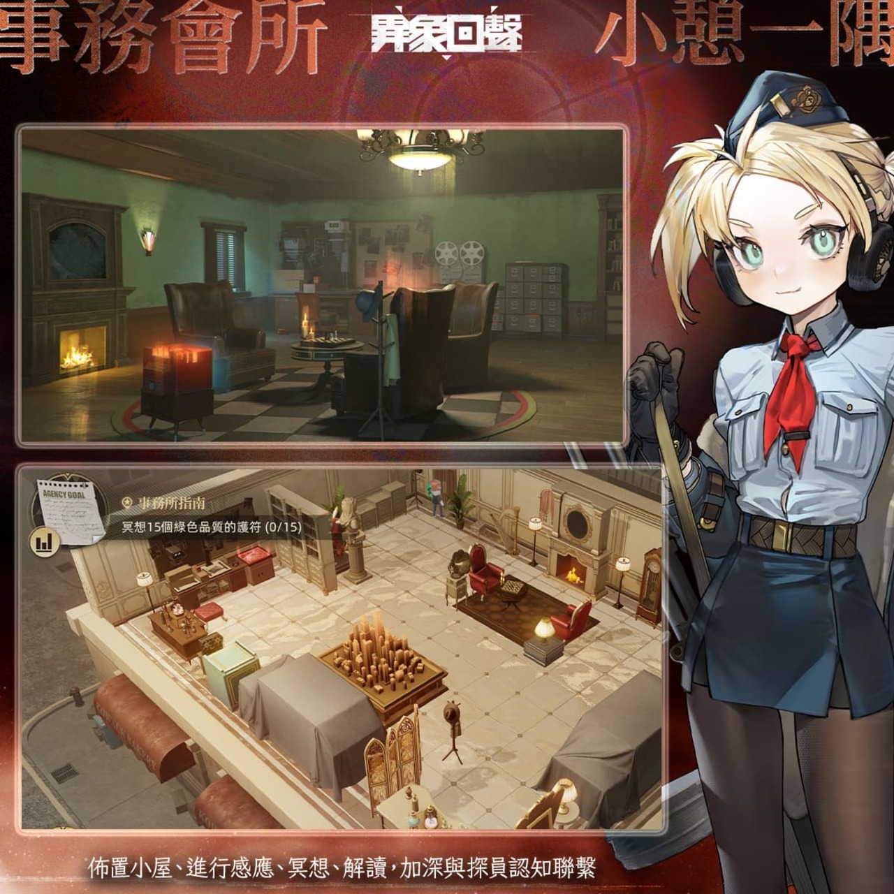 《異象回聲》還包含其他豐富的遊戲系統,「認知海域」是讓玩家深潛至意識當中,構築各種不同的「靈感」來應對戰局,成功通關就能獲取重要的道具「意識碎片」及解鎖其他道具獎勵;至於「事務所」除了提供佈置小屋的專屬空間外,也可進行感應「儀式元素」、冥想「儀式護符」、解讀「檔案殘片」,可以從中獲得行動資金或思維加速帶等各種資源收益,並加深與探員的認知聯繫。