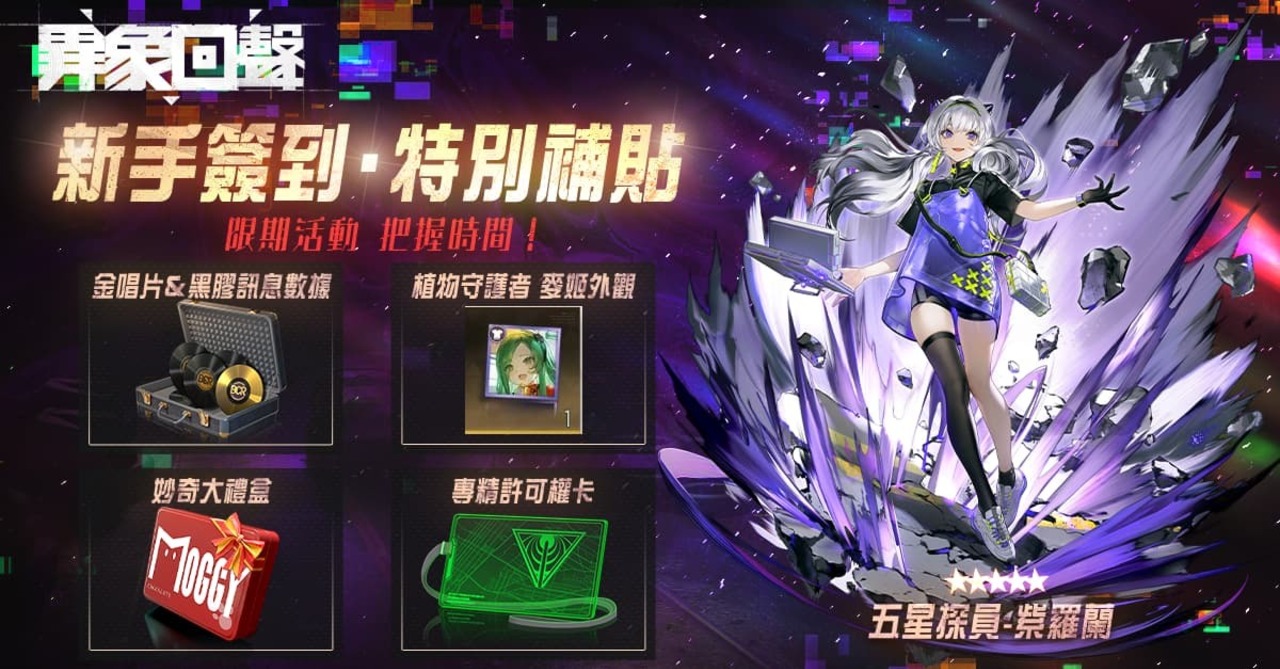 官方表示,新手加入每日簽到,更多豪禮等著你。首日簽到馬上再領取五星探員「紫羅蘭」,繼續累積登入與探員飾品「靈動狐耳・灰」、探員外觀「植物守護者 麥婭」、「黑膠訊息數據」5,600 和「金唱片」等虛寶。