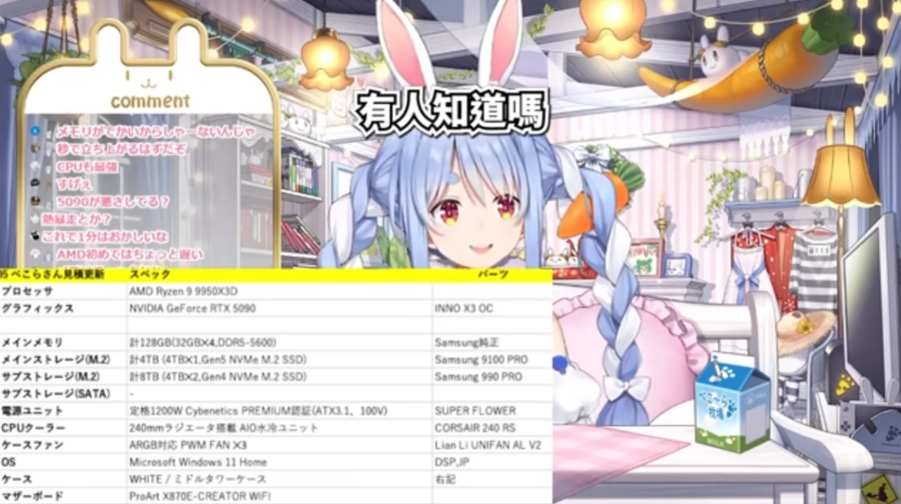 hololive JP 三期生 VTuber 兔田佩克拉(兎田ぺこら) 近日在直播中公開她新購入的遊戲電腦規格,豪華程度讓聊天室驚訝不已。根據配備推算,這台新電腦在日本當地價格約 130 至 150 萬日圓,折合新台幣約 30.5 萬元左右,堪稱頂級中的頂級。