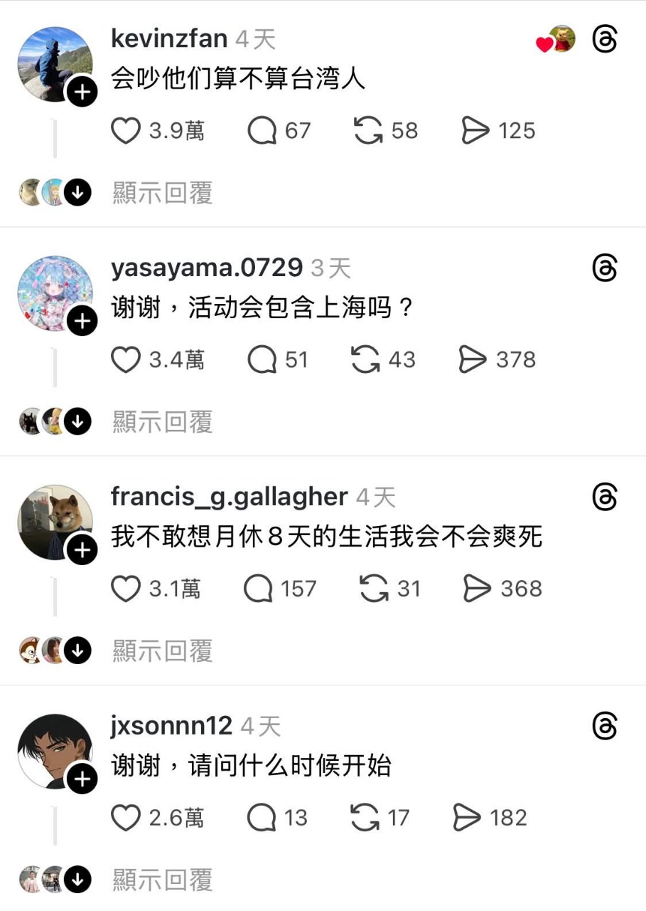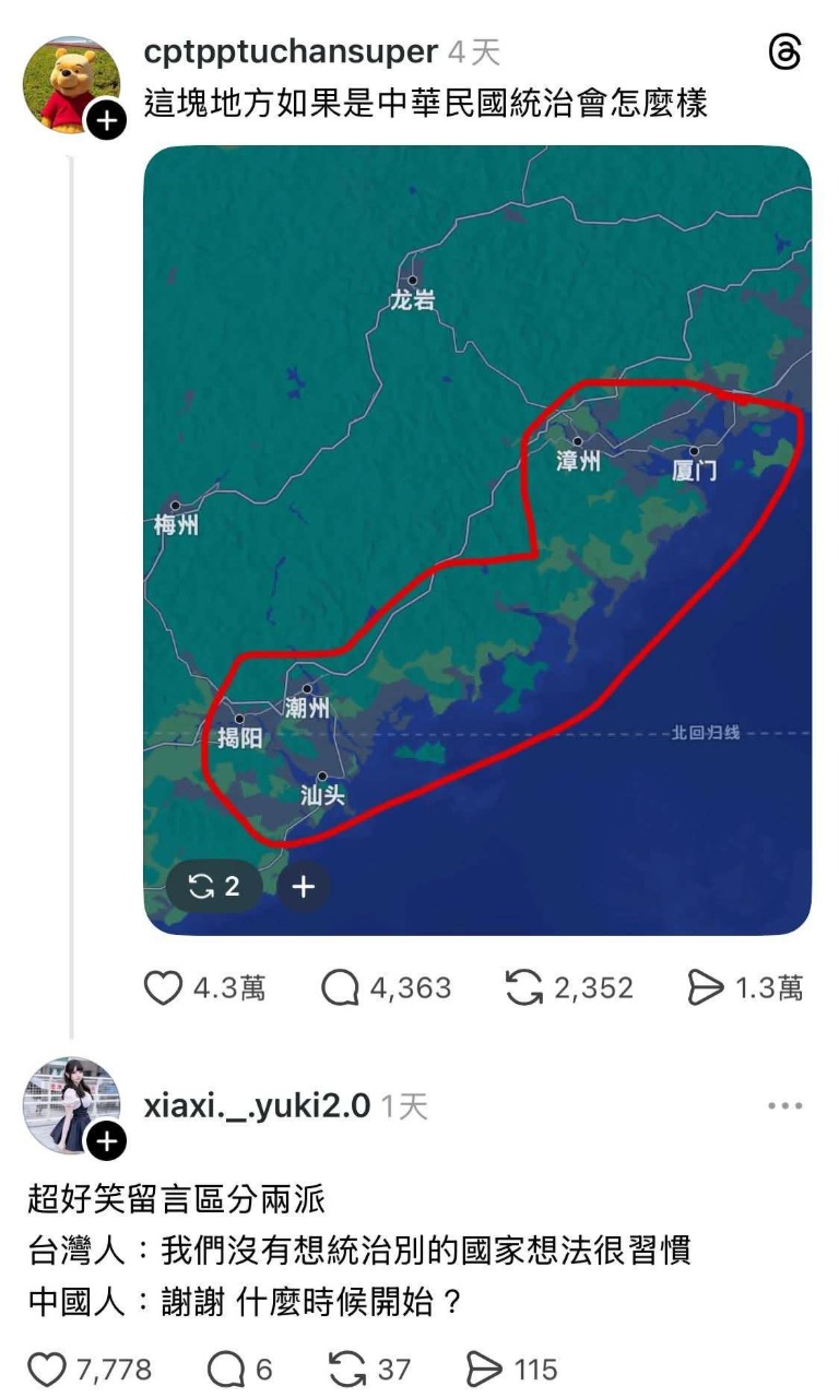 留言區分兩派真的很好笑 台灣人:我們沒有想統治別的國家想法跟習慣 中國人:謝謝 什麼時候開始? 看一些留言真的很替他們擔心ㄟ 你們講這種話真的不會出事嗎(????? 還有不少提到月休八天很爽 天啊那邊真的很多月休兩天四天的工作喔....哇...