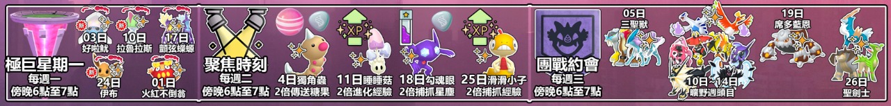 11月10日至14日「曠野週」期間,每天傍晚亦會特例加碼開放指定傳說寶可夢的團戰約會!