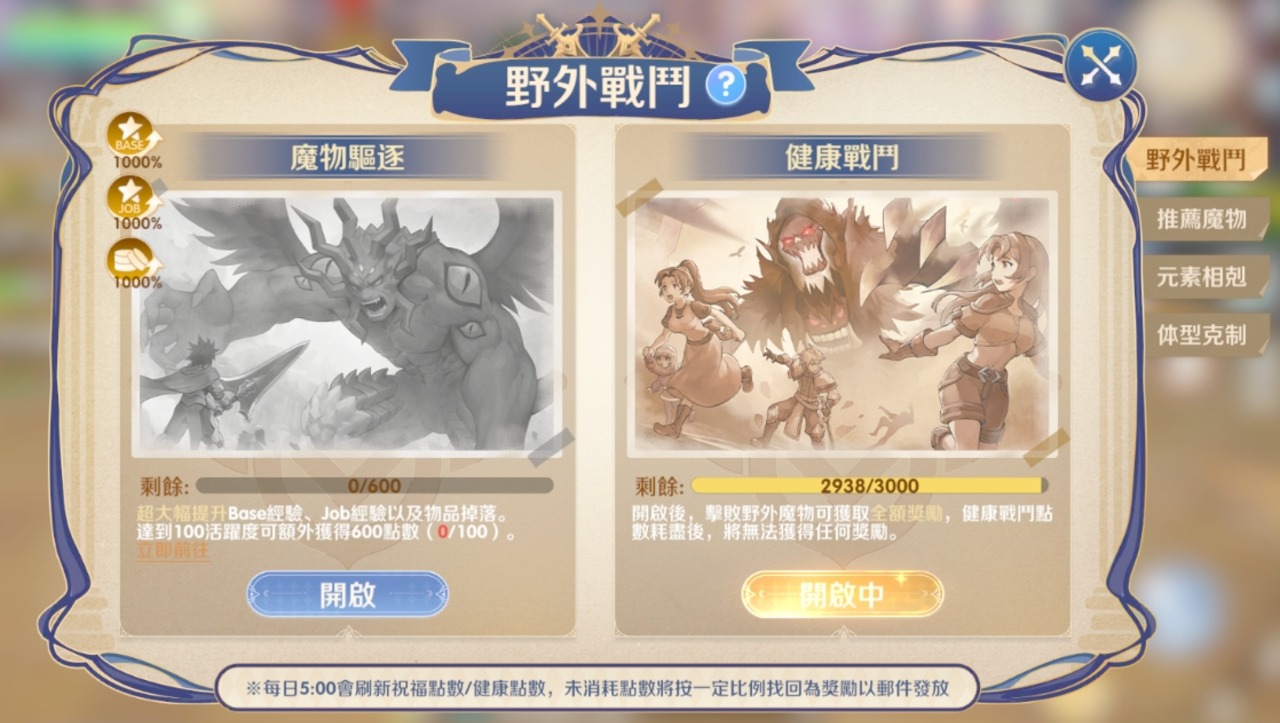 開啟健康戰鬥時,擊敗野外魔物可獲得完整獎勵。