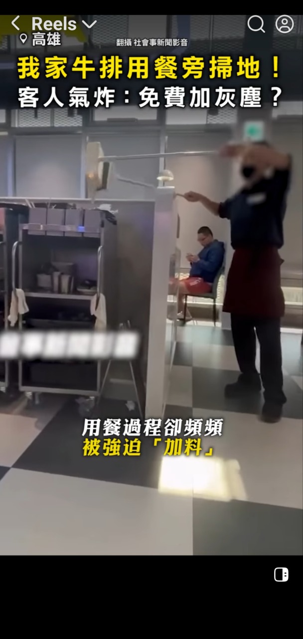 林小姐表示,結帳時向櫃檯反應,希望店員不要在客人用餐時掃地,導致用餐區灰塵漫天飛,但櫃檯人員卻皺眉,表示會向主管反應,林小姐認為賠償打折是其次,但店員的態度讓她無法接受,撂話「打死不再去」,並將影片放上網路讓網友評評理。