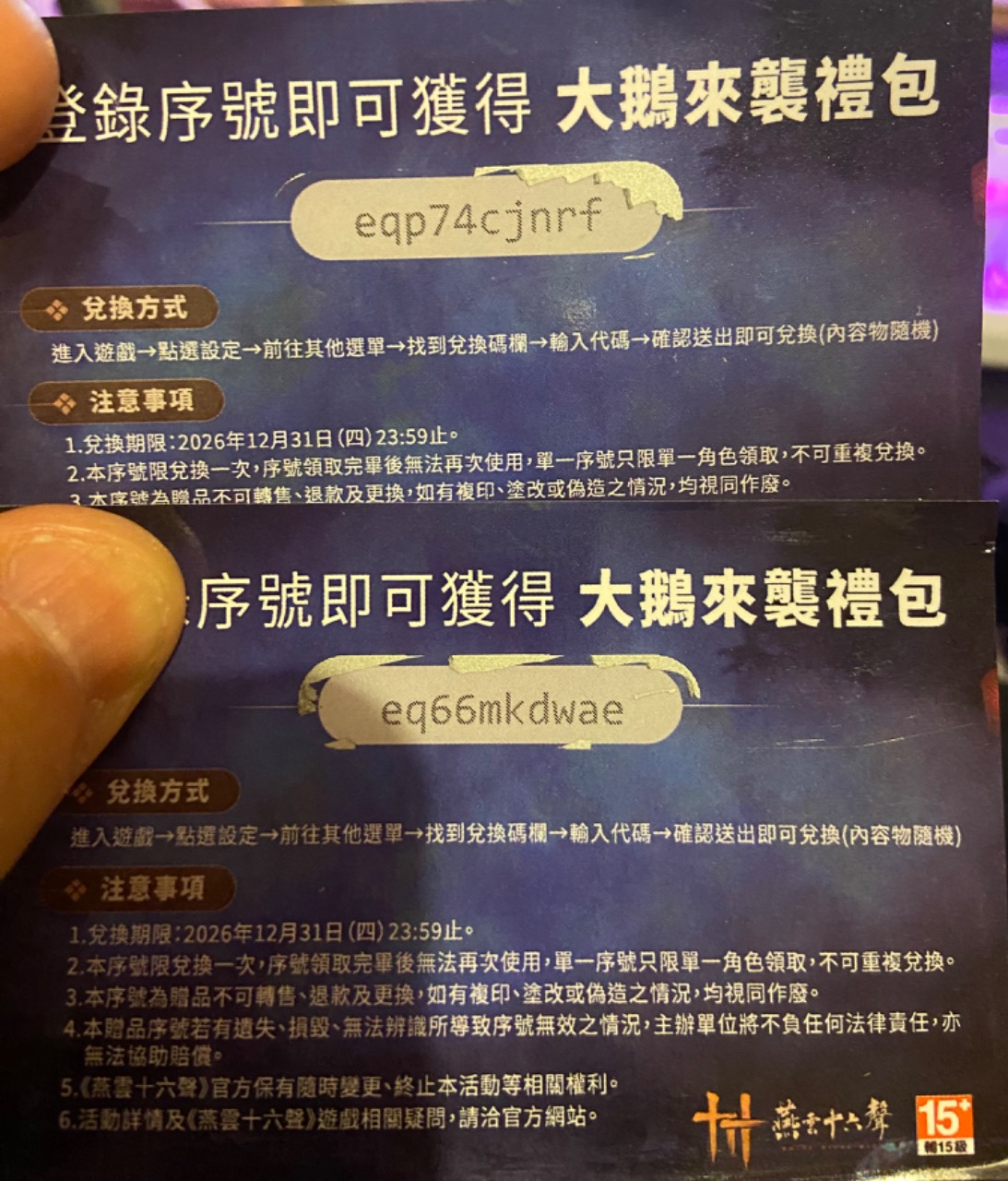 這兩張是在這星期活動的時候拿的,一個人只能用一次類似的兌換碼,我拿到三張自己用了一張,剩下這兩張給其他的人看有沒有需要,可以兌換到心法散本x2 銅幣20000,長明玉40