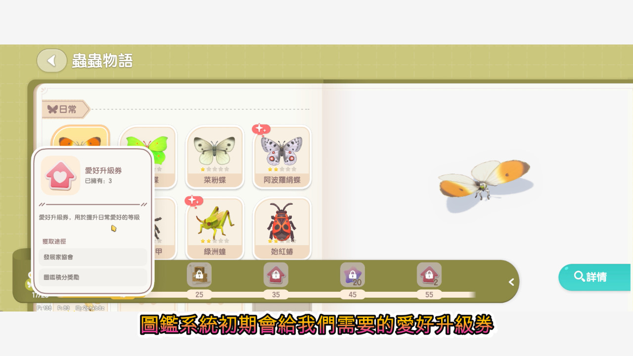 我相信這個版本觀鳥跟捕蟲初期是賺不了錢的,但他一樣值得你路過時蒐集一下品種跟星數,在該愛好的圖鑑下得到的愛好收集券可以早早把烹飪、園藝或釣魚升上去。