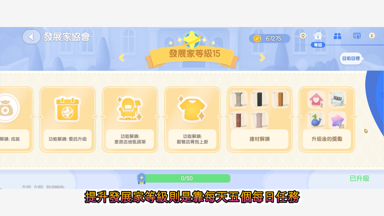 講到這裡我們必須要提一下愛好升級券的來源,第一個就是我們每一個愛好收集圖鑑星數時可以在圖鑑界面的右半邊得到升級獎勵,初期某些級數是會贈送愛好升級券的,而另外一個來源就是升級”發展家協會"等級時,某些級數會給愛好升級券,提升發展家等級則是靠每天五個每日任務來得到貢獻勳章才可以升級,打開選單選擇備忘錄,最右上角有個趣聞,點開後可以點”去完成居民的委託”,每天會有五個日常任務可以接,因此儘管你再肝,發展家等級也是照時程來的,沒辦法更快,而愛好升級券到中後期會很不夠,我目前都是拿來升級烹飪跟園藝,如果還夠我會選擇釣魚。