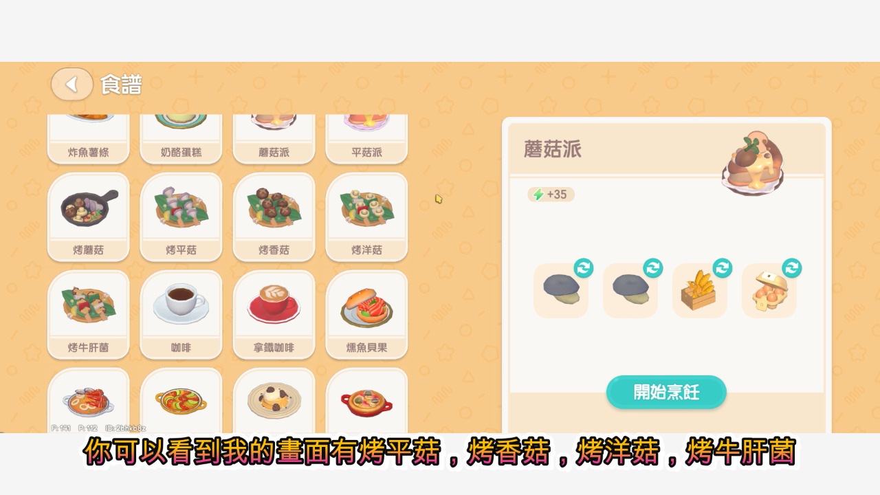 既然我們講到菇類,我們在初期就可以開啟"烤蘑菇”跟”蘑菇派"的菜譜,而這兩個菜譜跟什錦果醬一樣,只要你放入不一樣的菇類就會產生該菇類的特定料理,譬如烤蘑菇下,我放入四個平菇,那就會產生烤平菇,而蘑菇派放入兩個平菇就會變成平菇派,這也是我們刷烹飪星數的技巧。
