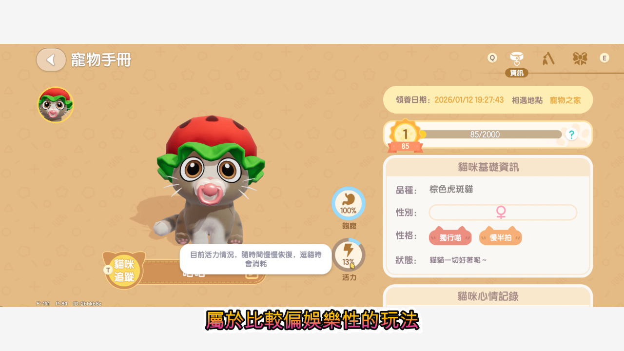 最後還要提醒一下愛好升級券是非常吃緊的,目前不可能每個愛好都升成高等級,我個人都把資源放在烹飪跟園藝上,除此之外寵物系統跟野生動物系統有機會每天送你禮物,屬於比較偏娛樂性的玩法,畢竟當你在家裡忙東忙西時旁邊有個小東西轉來轉去也是非常有趣的一件事,野外也會碰到各式各樣的可愛動物,都可以跟他們互動。
