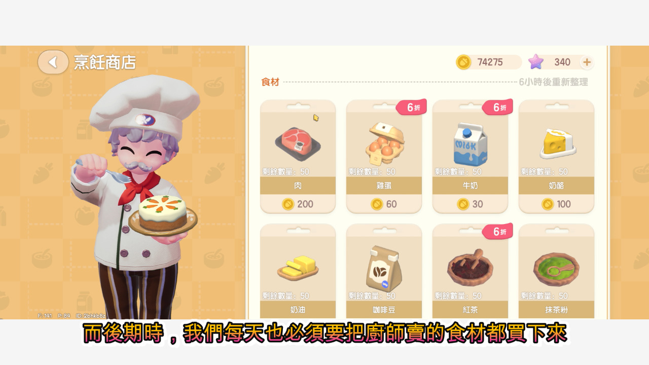 而後期時,我們每天也必須要把廚師賣的食材都買下來,但是肉的部分因為太貴了,必須要在打折的時候才要去買。不過要到後期應該要一兩個月,大家可以衡量一下自己每天進帳的金幣量力而為,但記得把這件事放在心上。
