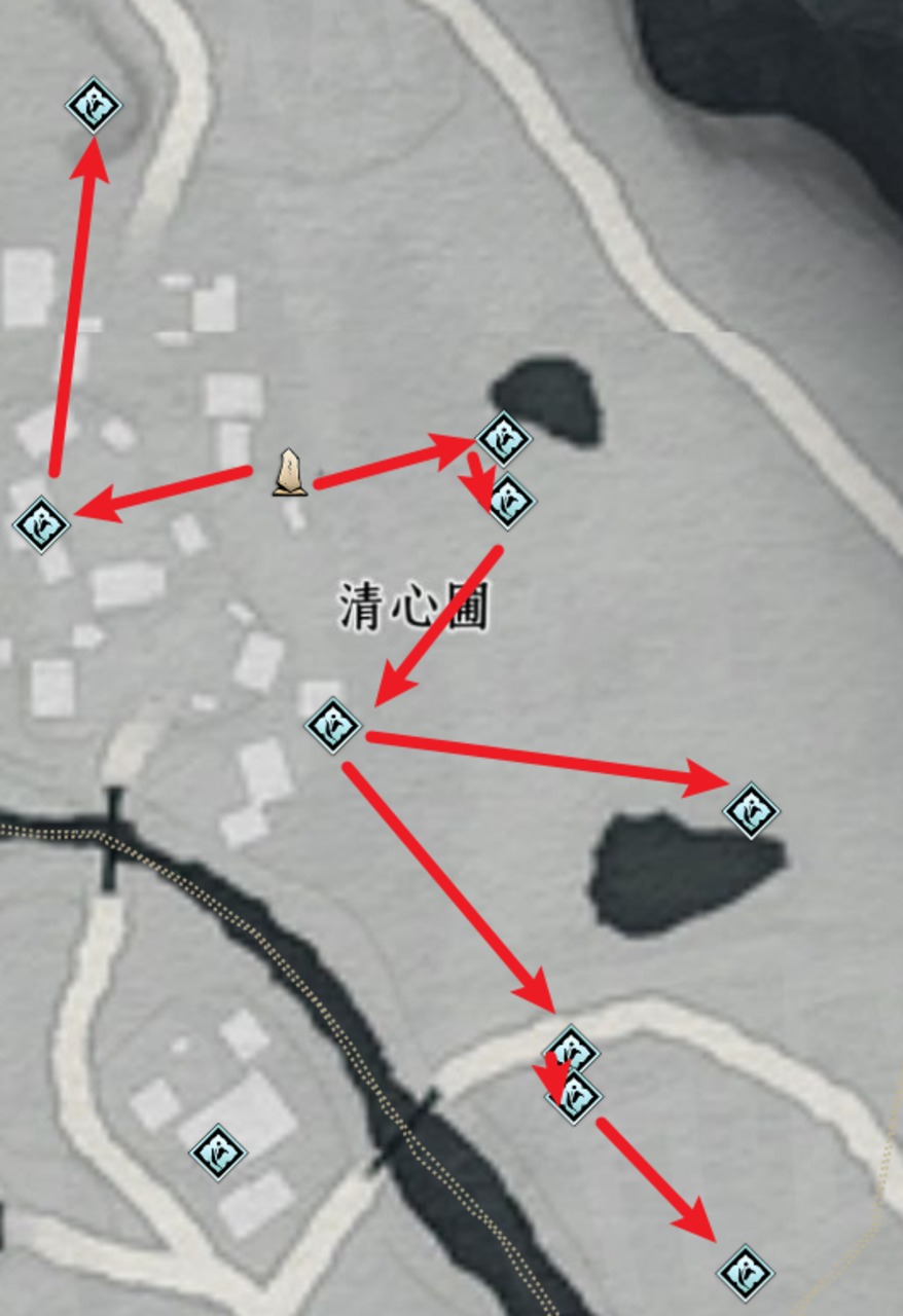 清心圃附近有9個蹊蹺可收集,位置與路線圖如下。