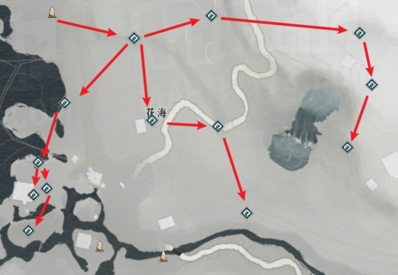 花海附近有13個蹊蹺可收集,位置與路線圖如下。