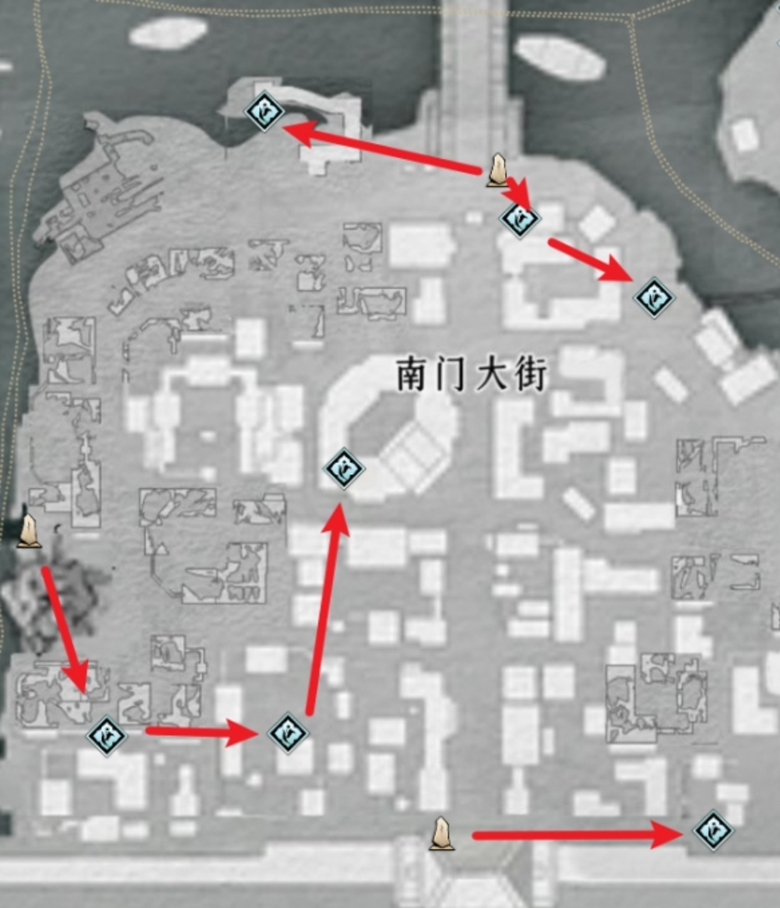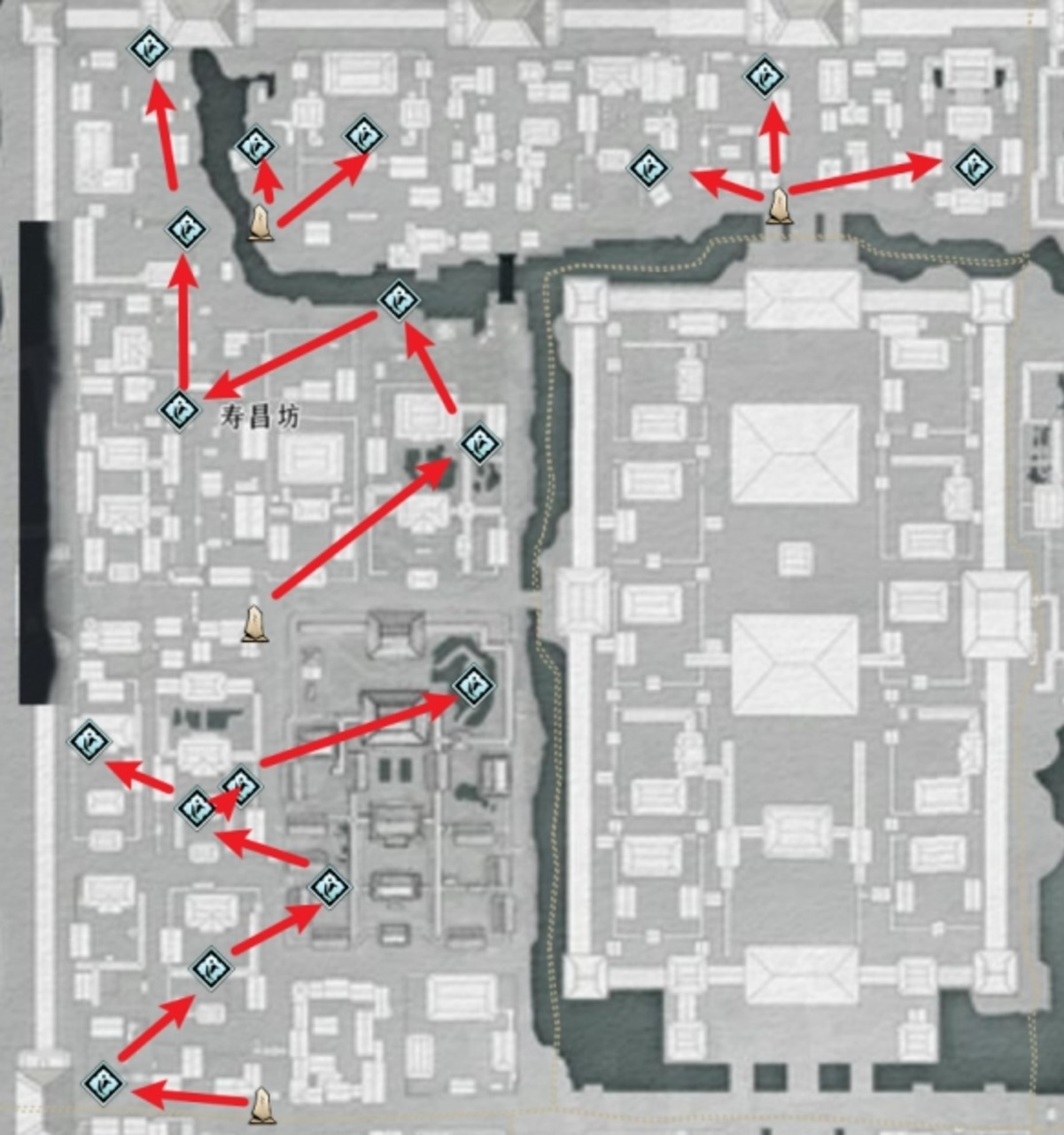 勾欄瓦肆附近有17個蹊蹺可收集,位置與路線圖如下。