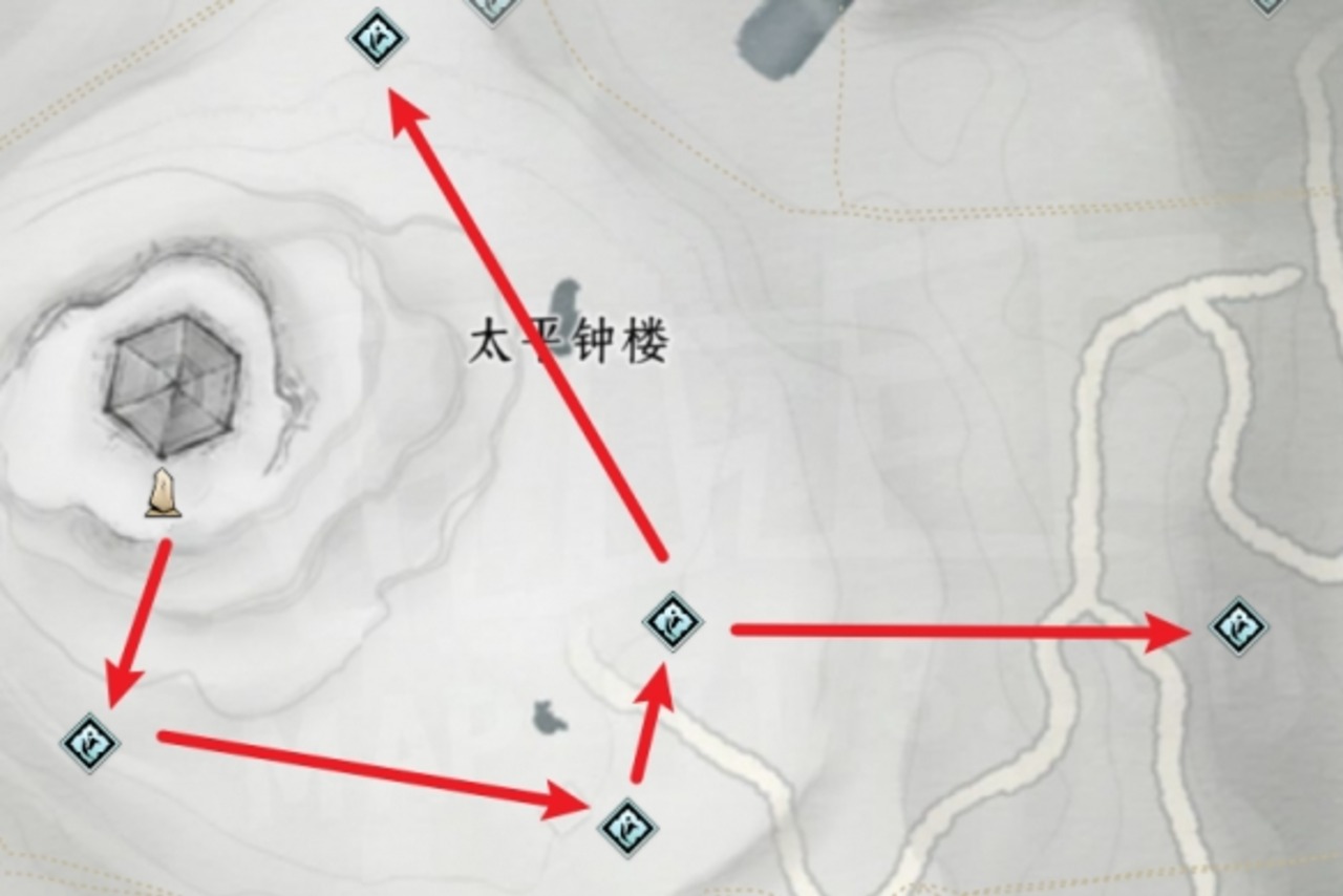 太平鐘樓附近有5個蹊蹺可收集,位置與路線圖如下。