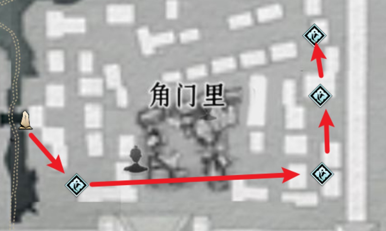 角門裡附近有4個蹊蹺可收集,位置與路線圖如下。