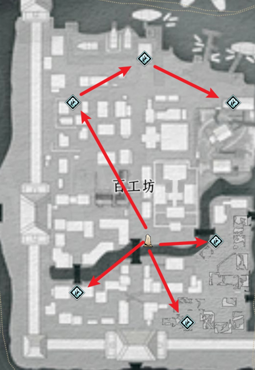 百工坊附近有6個蹊蹺可收集,位置與路線圖如下。