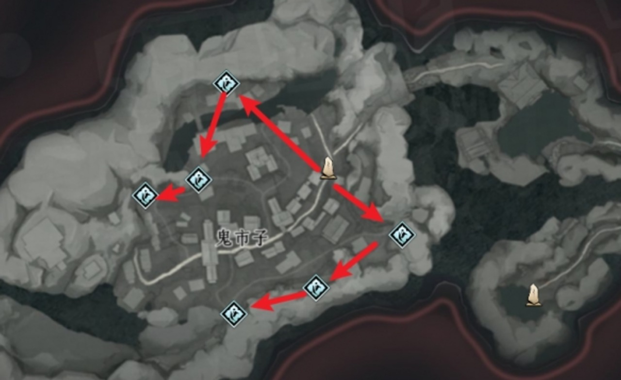 鬼市子附近有6個蹊蹺可收集,位置與路線圖如下。