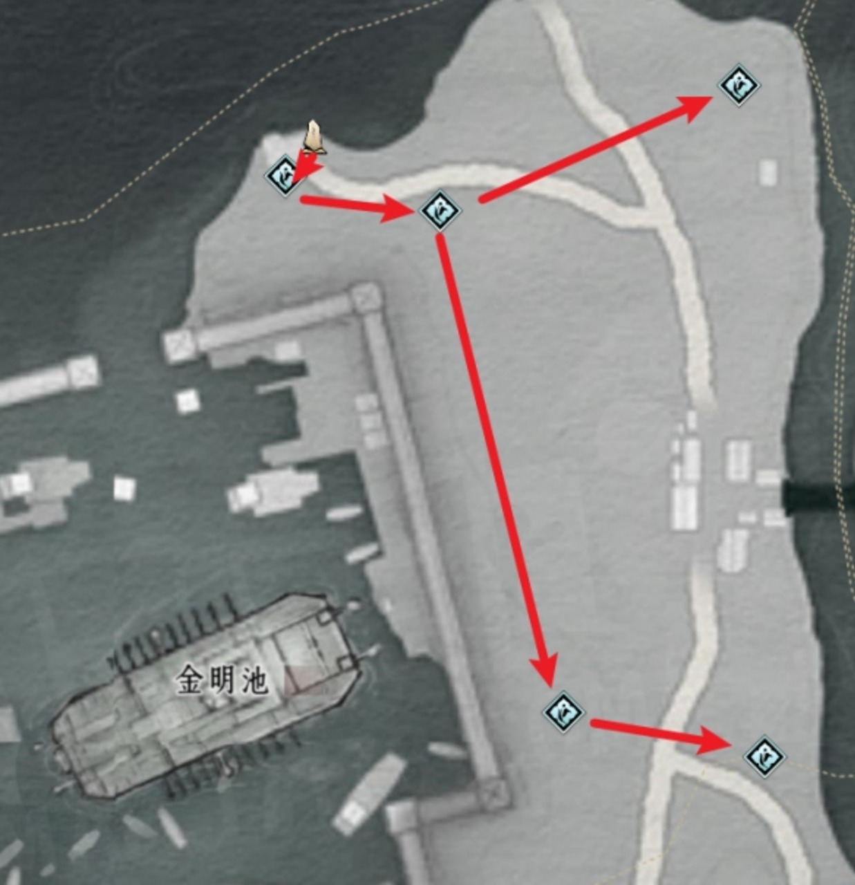 金明池附近有5個蹊蹺可收集,位置與路線圖如下。