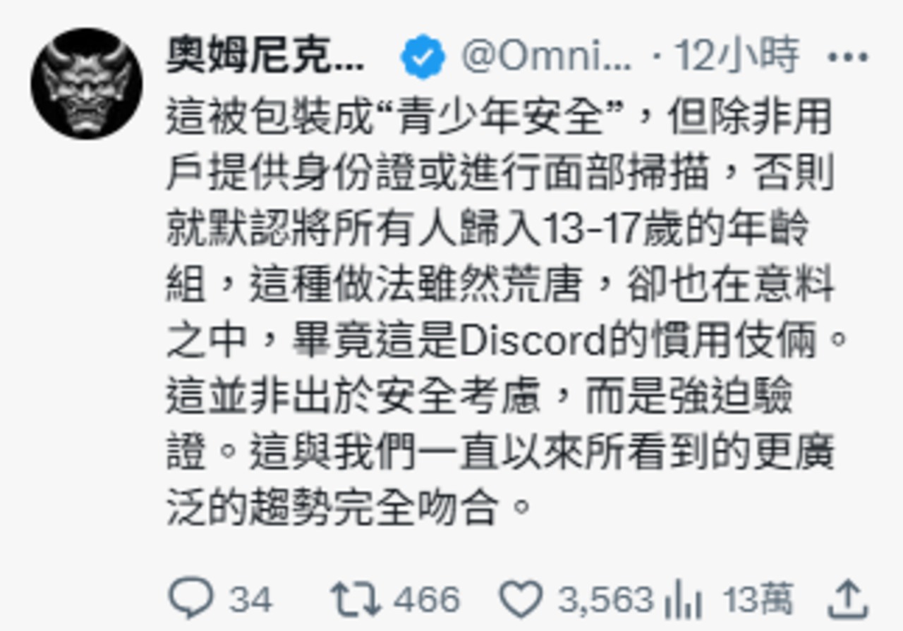 在驗證方式上,Discord 採取「隱私優先」策略,除臉部年齡估算與證件掃描外,也導入「年齡推斷」技術,透過帳號行為判斷是否為成人,多數成人使用者可無須額外操作即可正常使用功能。官方表示,相關資料會快速刪除,且年齡狀態僅限使用者本人可見。