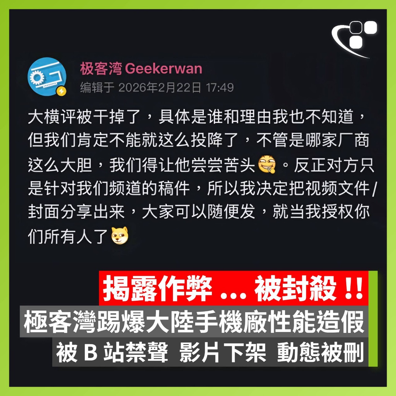 大陸評測媒體《極客灣》Geekerwan 近日發布《手機遊戲表現大橫評:廠商作弊太瘋狂!》,該期性能橫評影片中,揭露中國多家手機廠商向媒體提供的「送測機」進行性能「特調」造假。該影片被施壓下被全網下架,其後極客灣在 B 站發布動態聲明反擊亦被禁聲,果然是誰大誰惡誰正確。