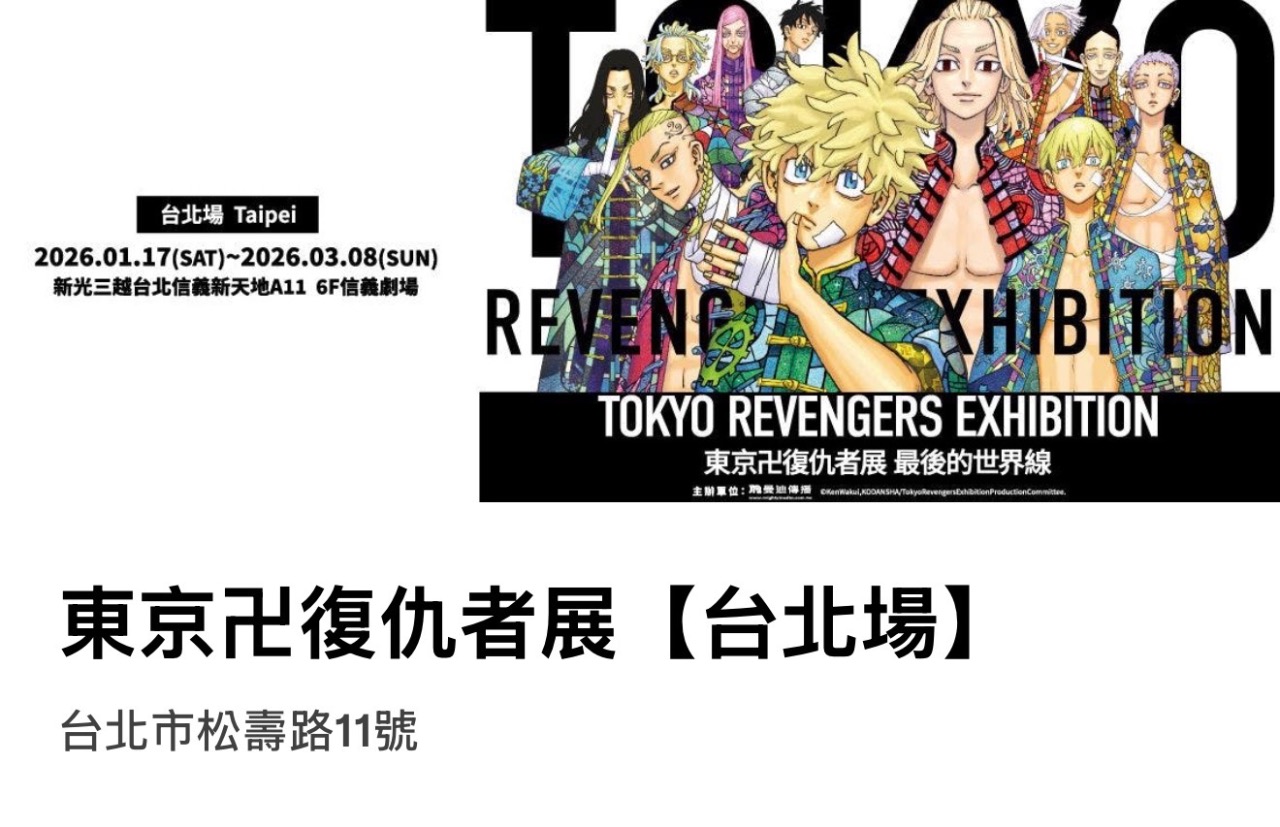 官方體驗型展覽 《TOKYO卍REVENGERS EXHIBITION 東京卍復仇者展 最後的世界線》,即將於 2026 年 1 月 17 日 在台北正式開展。本次展覽選址 新光三越台北信義新天地 A11,並同步販售日本進口與台灣限定展覽周邊,為「東卍」粉絲帶來一次完整且具收藏價值的觀展體驗。