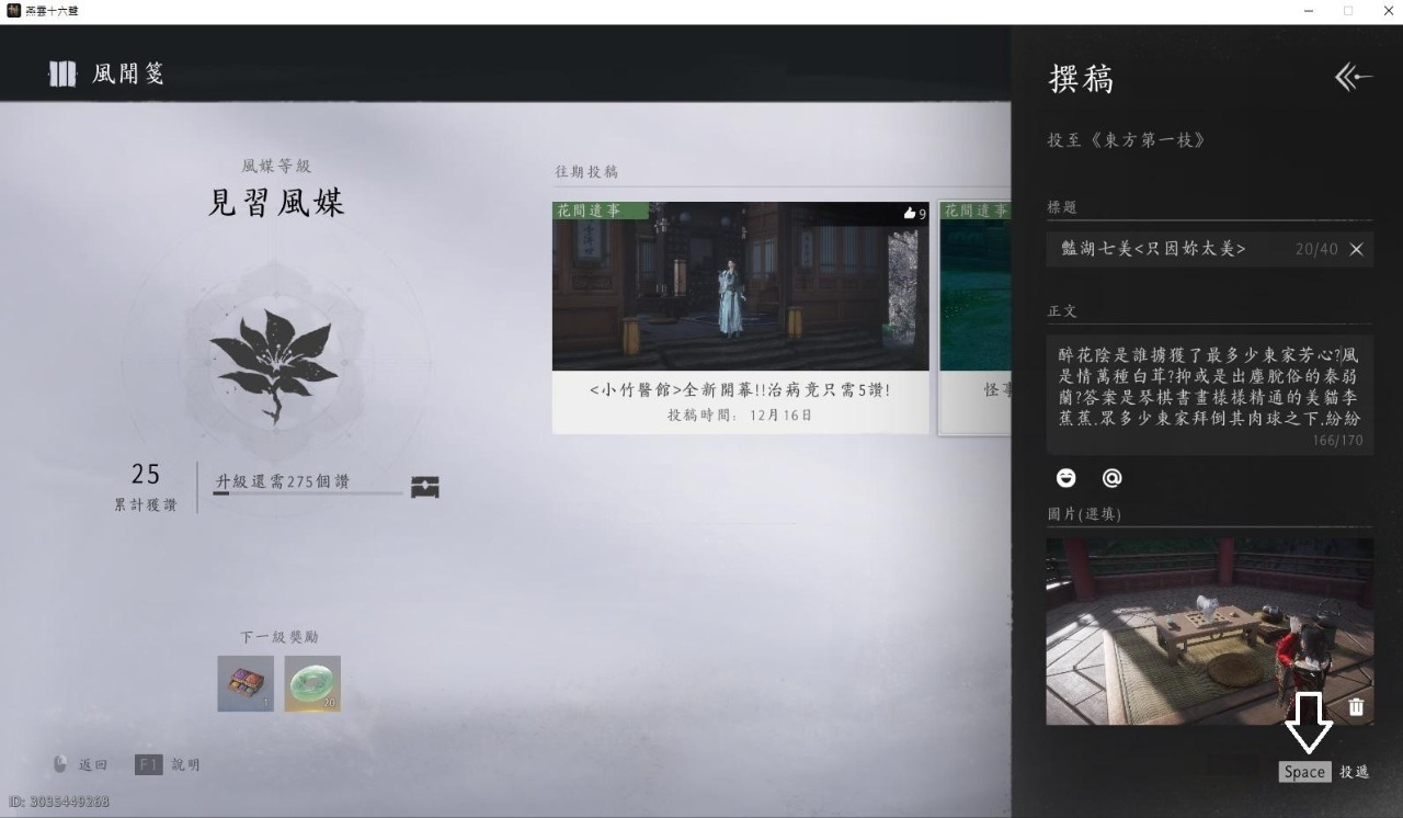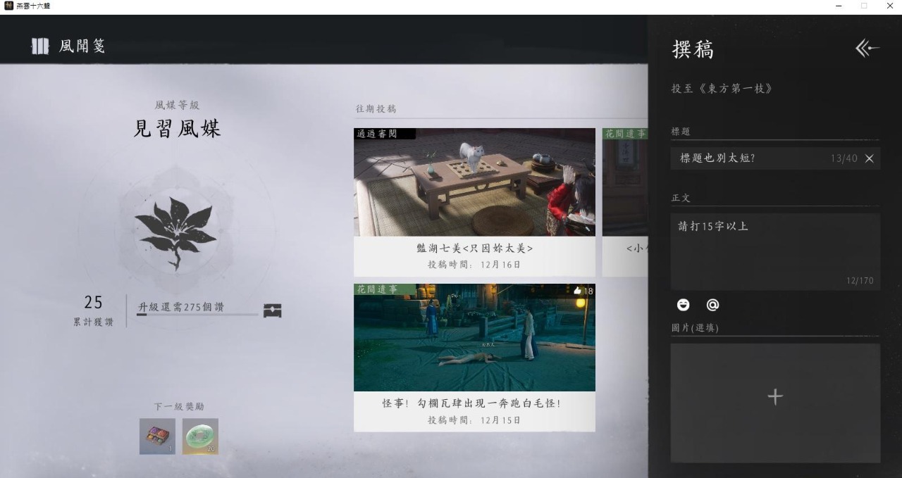 撰稿之前如果你想要添加圖片的話,記得先使用遊戲相機功能拍好這次要用的照片,目前只能使用遊戲相機拍攝的照片。