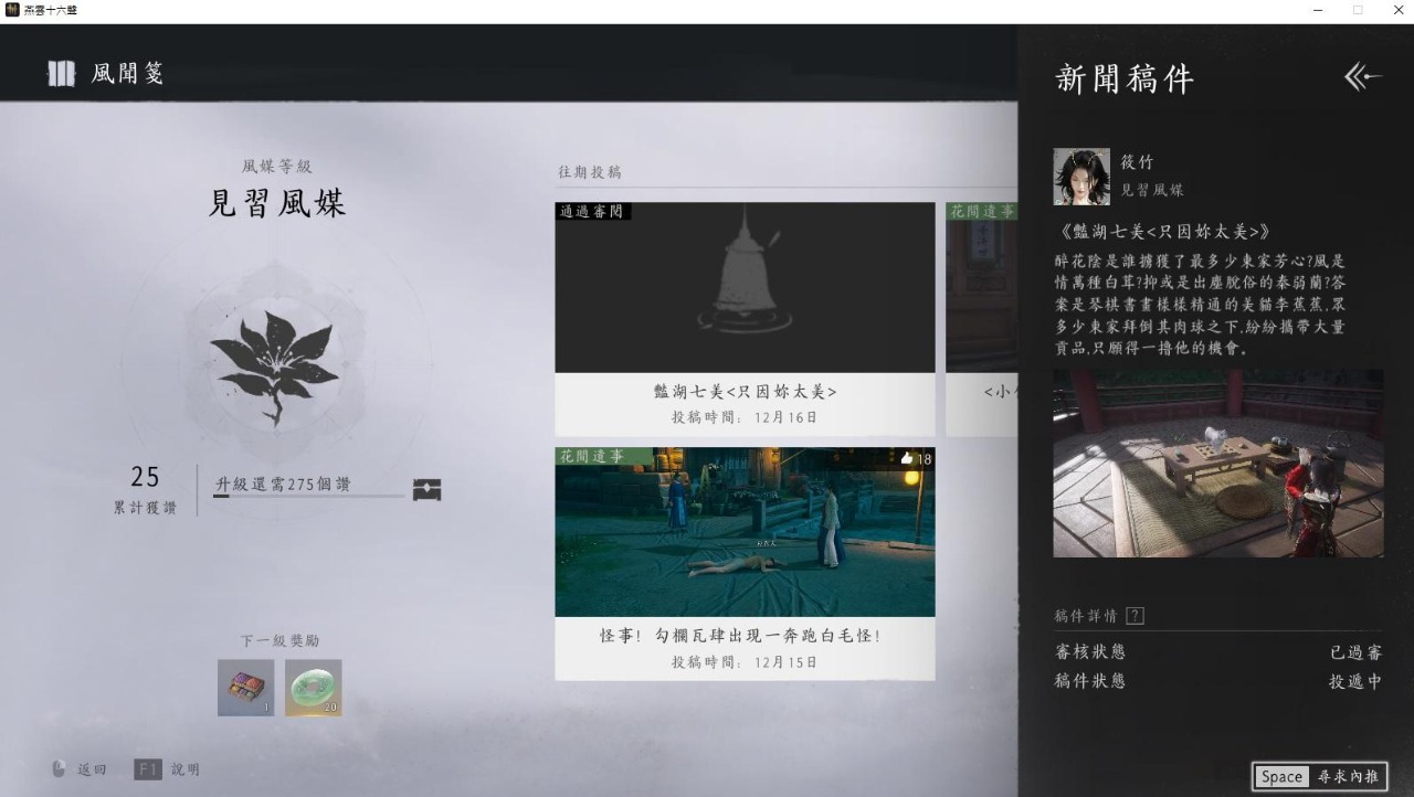 投遞後我們就能看到下圖,代表成功了,這時我們要等到明天才能上報,尋求內推則是限定醉花陰門派二色蓮以上弟子的玩家才能幫你,會依照對方階級獲得點讚數(下面會說明),邀請似乎有時效性,所以最好確定對方也在線上。