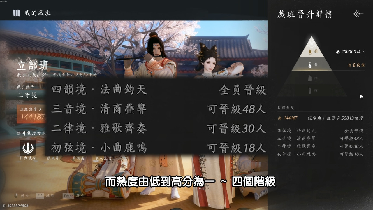 入派後需完成「藝名搶奪(先搶先贏)」與「考核分班」。梨園的晉升制度對懶人非常友善: