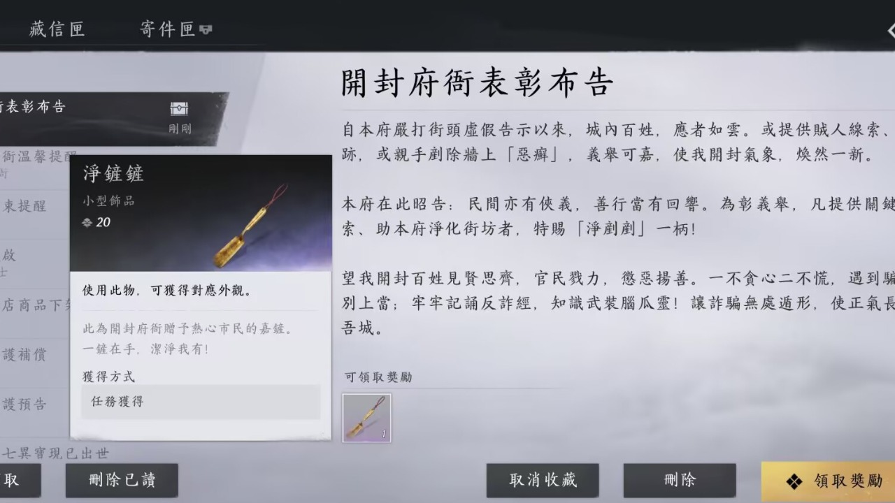 「開封三好市民」: 跑到圖片標示的指定位置晃一晃,會收到一封信。點開信件看完,就可以接取「淨鏟鏟」奇遇任務! 然後跟著任務引導解完,就能拿到獎勵和隱藏成就 💡 解完任務後,去郵件裡,可以領到淨鏟鏟配飾!