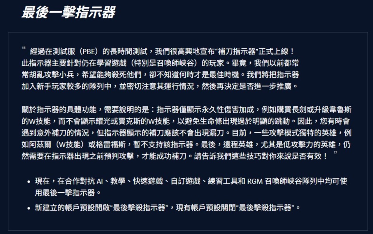 《英雄聯盟》26.5 版本推出「尾兵輔助」 補刀吃兵輔助功能,是可以幫助玩家更容易尾刀小兵的系統, 目前主要在「非排位模式」上線,會在小兵血條顯示可擊殺的傷害門檻,考慮部分英雄被動、效果等,但不包含法術傷害或暴擊。 此功能可由系統設定開啟,僅計算永久傷害加成(如裝備、技能等級),不計入閃耀劍或賈克斯 W 等臨時加成。