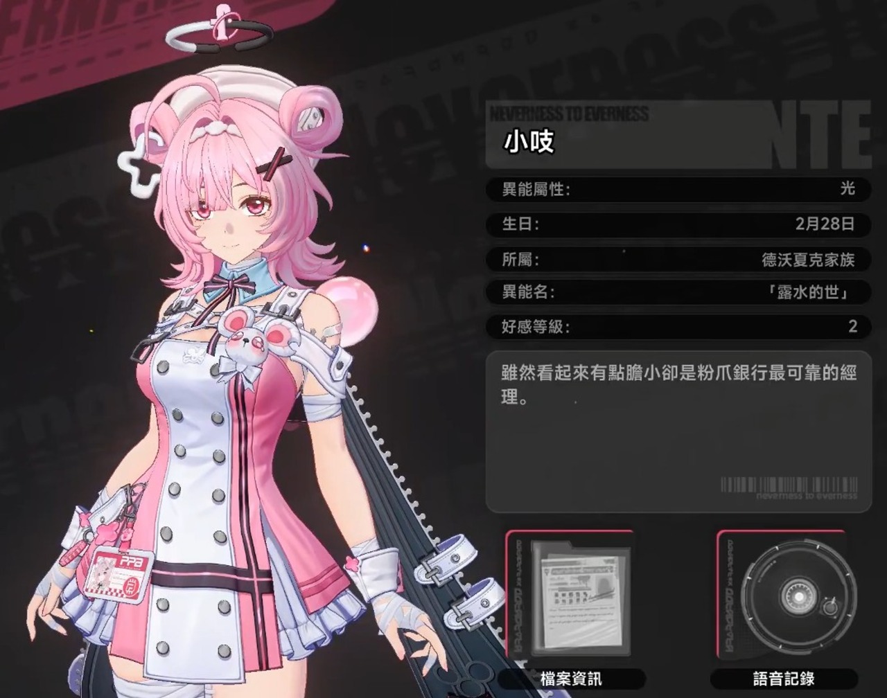 主角是我們一開始就會用到的角色,不先升上去就較難使用。雖然輸出能力較弱,但是創生花體系的另一名重要角色,而且會快速積累滿環合能量,並且是光屬性,不管是打創生還是打延滯都是非常重要的關鍵位置。