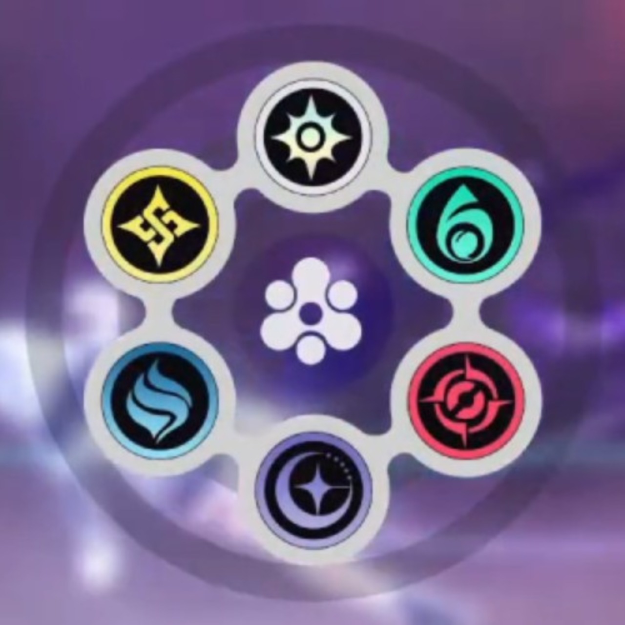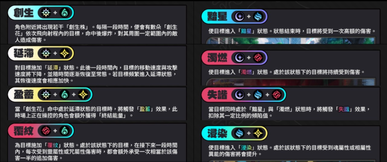 角色屬性分為光、靈、相、魂、咒、暗六種,相鄰屬性配合可以打出環合反應。