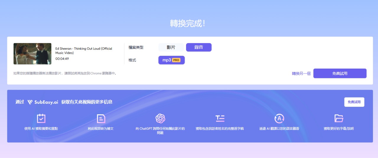 使用入口:https://www.subeasy.ai/zh-TW/youtube-to-mp3