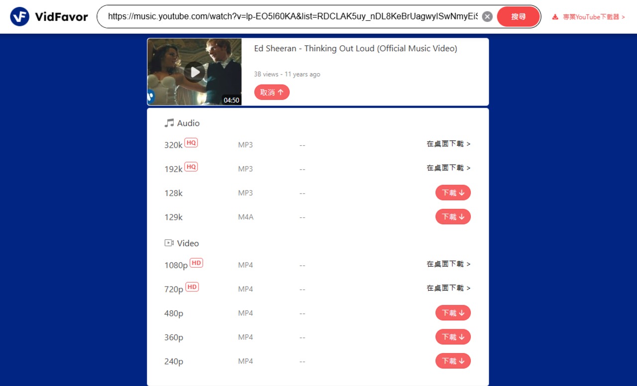 VidFavor VidFavor是專為中文使用者設計的線上工具。同時它針對音樂下載優化了其解析引擎,能更精準地抓取 YouTube Music 上的音軌,且支援多種位元率選擇。